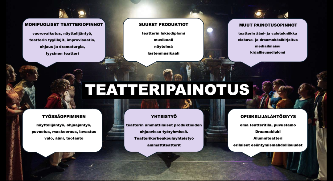 Vaskivuoren lukiossa voit opiskella teatteritaiteen opintoja poikkeuksellisen monipuolisesti ammattilaisten ohjauksessa. Teatteriopetuksella on oma teatteritila ja puvustamo, mikä mahdollistaa ammattimaisen teatteriopetuksen. Voit valita erilaisista opintokoreista itseäsi kiinnostavia sisältöjä ja polkuja ja syventää siten itseilmaisuasi ja osaamista vaikkapa jatko-opintoja ajatellen. Meillä voit valita opintoihisi mm. roolityöskentelyä, ohjausta, dramaturgiaa, fyysistä teatteria, improvisaatiota tai syventyä teatterin tyylilajeihin. Jos sinua kiinnostaa ääni- ja valotekniikka, lavastus tai käsikirjoittaminen, tekemällä oppimisen kautta näidenkin opintojen suorittaminen on meillä mahdollista. Voit myös kehittää näyttelijäntyön taitojasi osallistumalla draamaklubille tai tehdä teatterin lukiodiplomin vaikkapa ohjauksen, näyttelijäntyön, käsikirjoittamisen tai valotekniikan näkökulmasta. Teemme tiivistä yhteistyötä teatterikorkeakoulun ja teatterin ammattilaisten kanssa mm. musikaali- ja näytelmäproduktiossa. Produktiomme ovat erittäin hyviä ponnahduslautoja suuremmillekin lavoille. Laaja-alaiset teatteriopinnot Vaskivuoren lukiossa antavat vahvan pohjan teatterialan jatko-opinnoille. Monet Vaskivuoren entiset opiskelijat ovatkin teatterialan ammattilaisia.