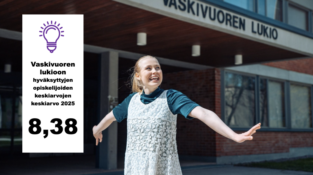 Vaskivuoren lukiossa pääset toteuttamaan itseäsi ja mieltymyksiäsi! Suuren lukion etuna on kattava opintotarjonta, josta voit valita opintojaksoja kiinnostuksesi mukaan. Monipuolinen valikoima eri akateemisten ja taideaineiden opintoja sekä aktiivinen kansainvälinen toiminta antavat opiskelijalle uudenlaisia mahdollisuuksia ja tulevaisuuden taitoja. Lisäksi meillä on tarjolla urheiluvalmennusta mm. muodostelmaluistelussa, jääkiekossa, yksilölajeissa ja jalkapallossa. Meillä pääset oppimaan työelämätaitoja erilaisten opintoretkien, vierailijoiden, työpajojen ja työssäoppimisen kautta. Tulevaisuuden taitoja harjoitellaan mm. yhdessä tekemisen, tutkimalla oppimisen ja vuorovaikutuksen keinoin. Opiskelijoiden ääni on vahvasti läsnä lukiomme arjessa.